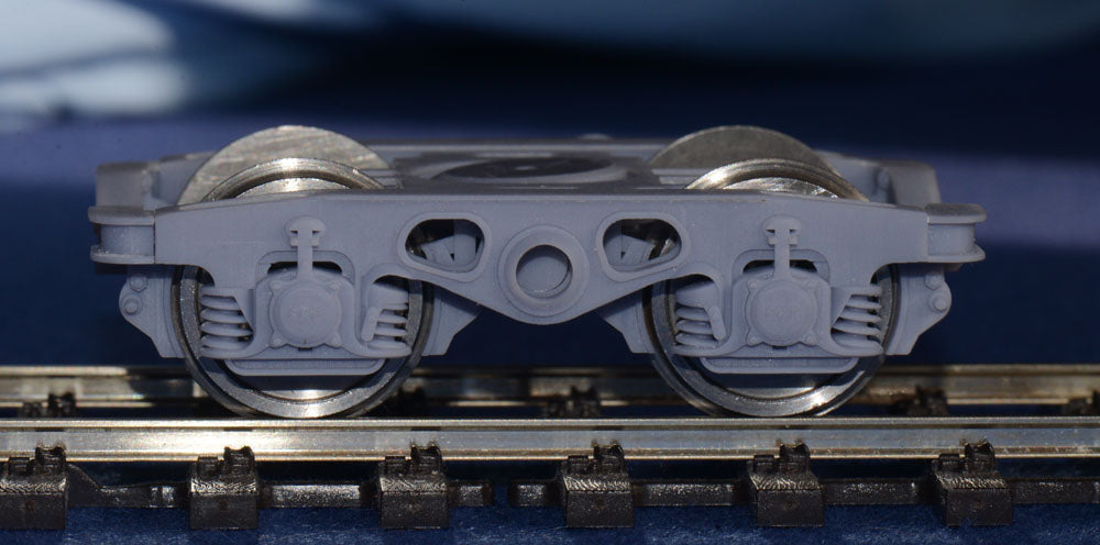 The 1st photo is of an example of the item parts as you will receive them (1 bogie is shown, but you receive parts to complete two bogies). The remaining photos show an assembled example to show off the detail, complete with 3' 1" diameter [21.6mm] wheels (not supplied). Slaters or Easybuild wheels have been tested and clear the brakes shoes nicely. Course scale wheels are likely to require some sanding of the shoes to provide clearance.